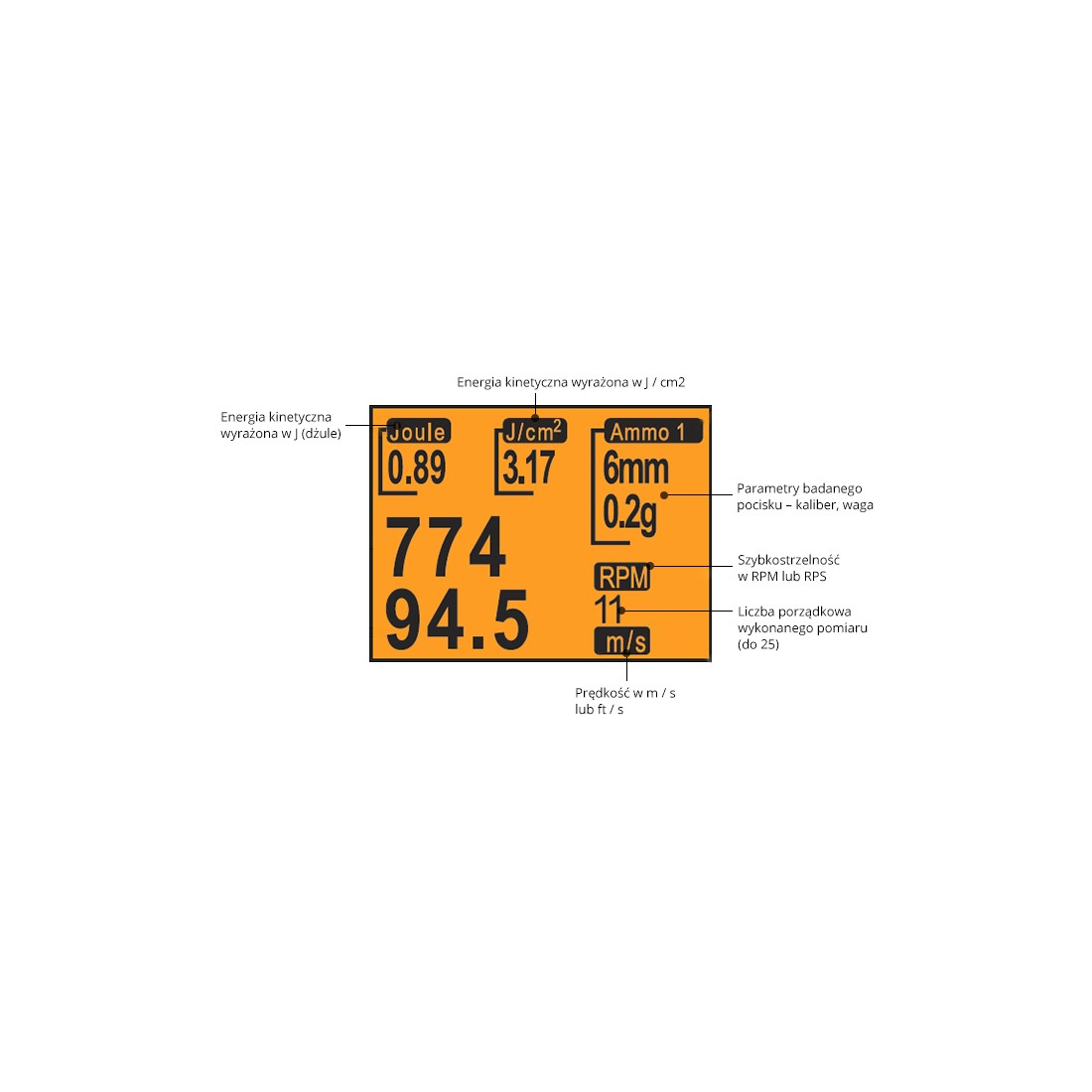 - Pomiar prędkości wylotowej w zakresie [ft/s]: od 90 do 1200
