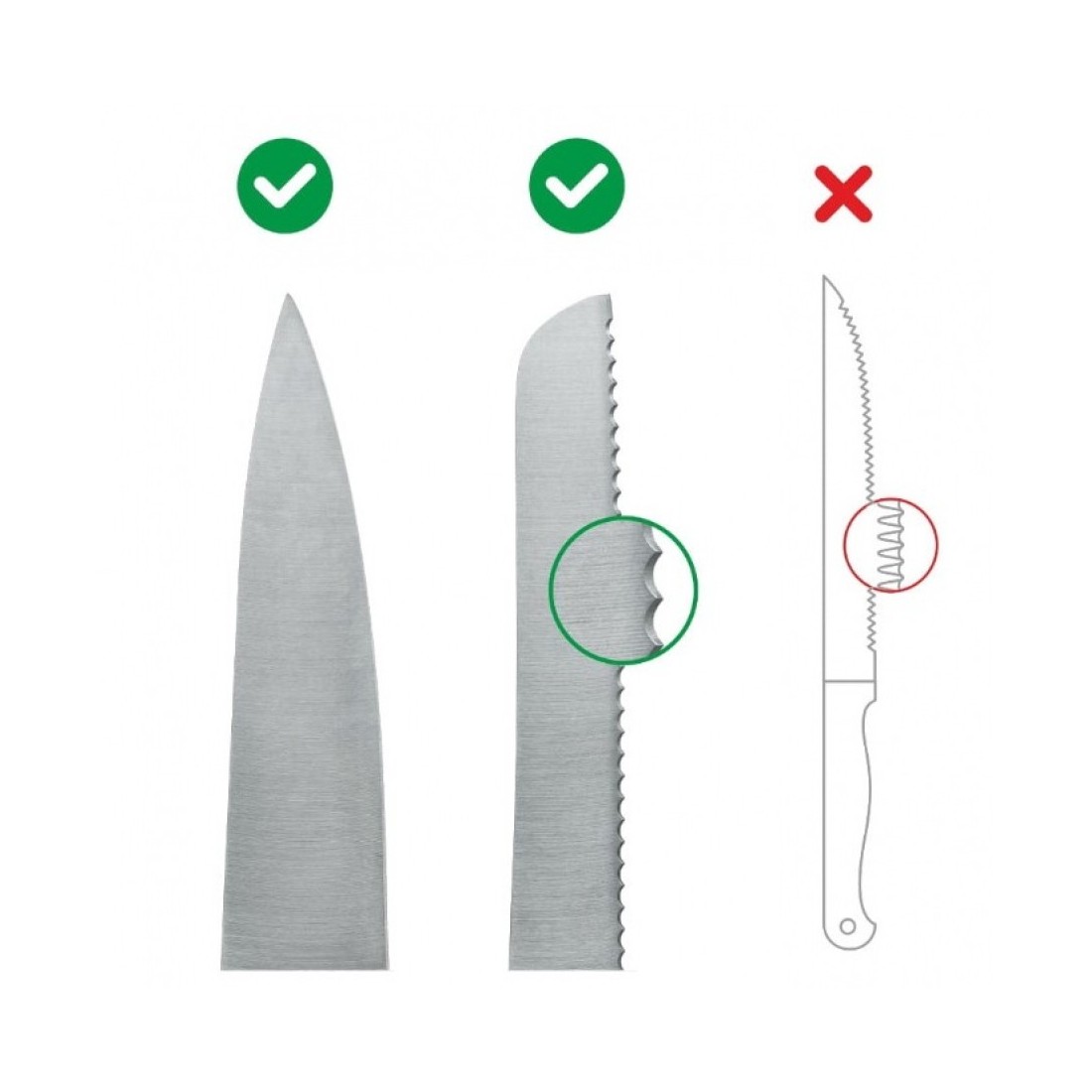Za pośrednictwem jednej ostrzałki można naostrzyć zarówno noże z ostrzem gładkim, jak i ząbkowanym (wyłączając noże z drobnymi ząbkami do steków).