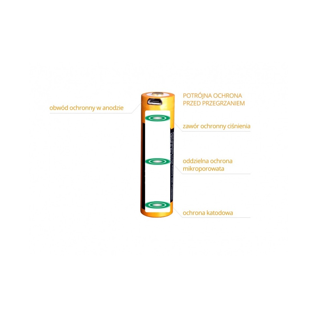 - katoda z zabezpieczeniem PTC (zabezpieczenie przeciwprzeciążeniowe)