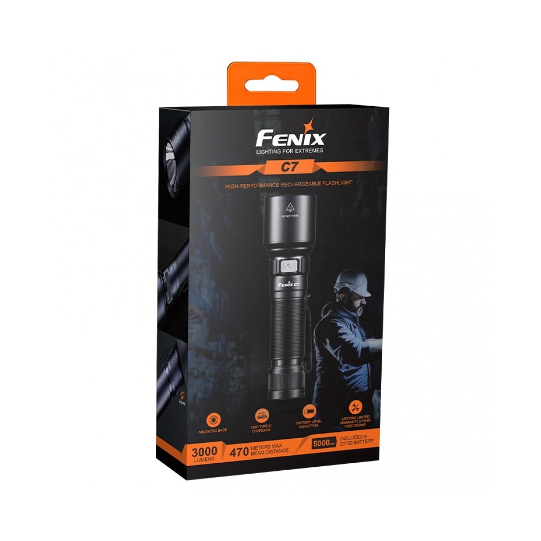 Fenix C7 to latarka przemysłowa dużej mocy, w której zastosowano nowoczesne rozwiązania m.in. strumień światła 3000 lumenów o zasięgu do 470 m, potężny akumulator 21700 o pojemności 5000 mAh, port USB-C do szybkiego ładowania oraz diodowy wskaźnik poziomu energii.