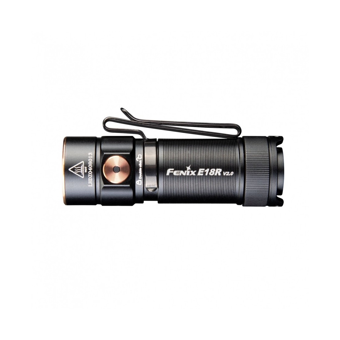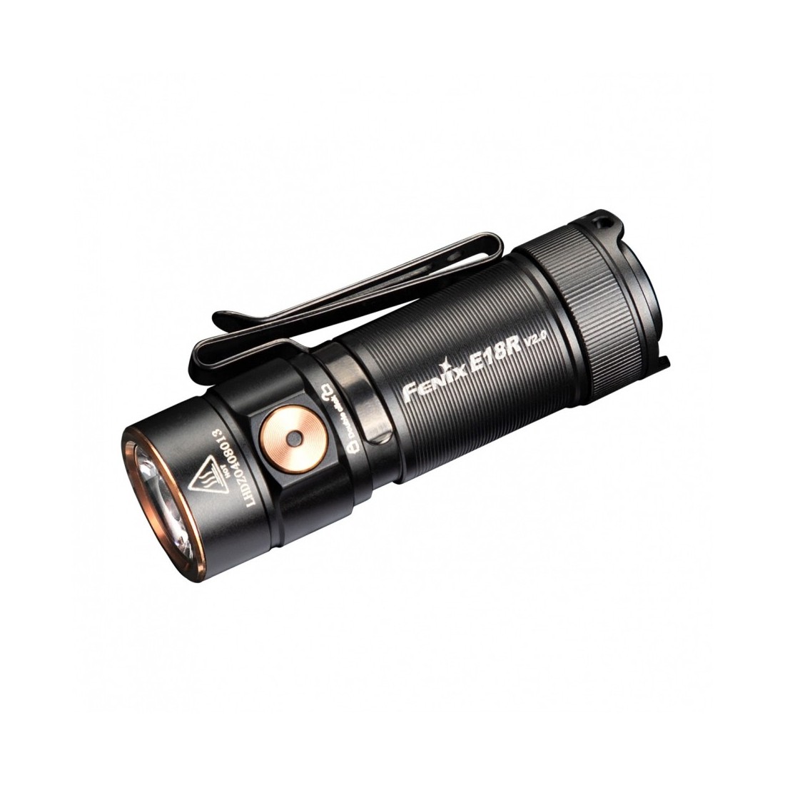 Fenix E18R V2.0 to kieszonkowa latarka edc o strumieniu 1200 lumenów, wyposażona w port ładowania USB-C, wskaźnik poziomu akumulatora, blokowany włącznik, dwukierunkowy klips oraz akumulator 16340.