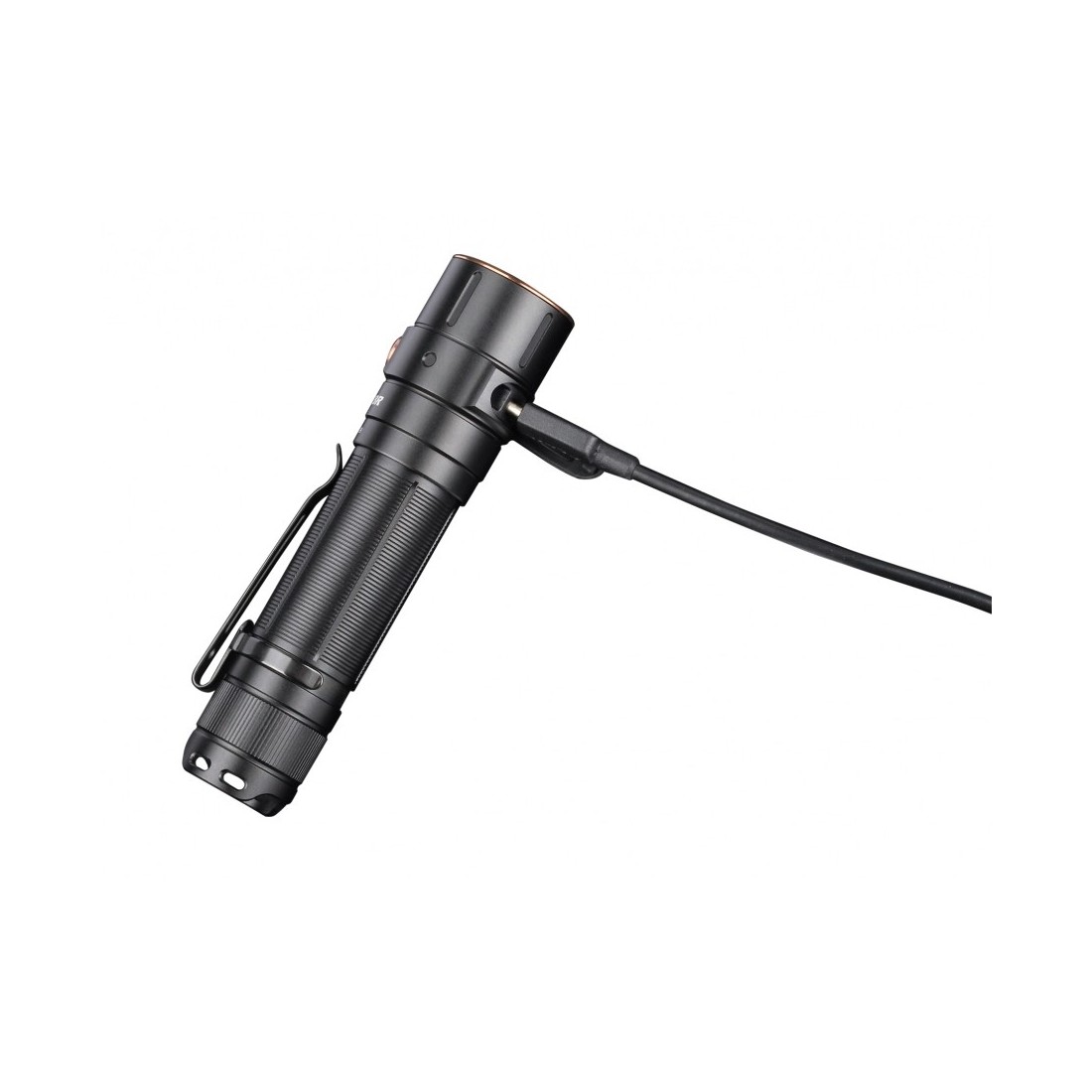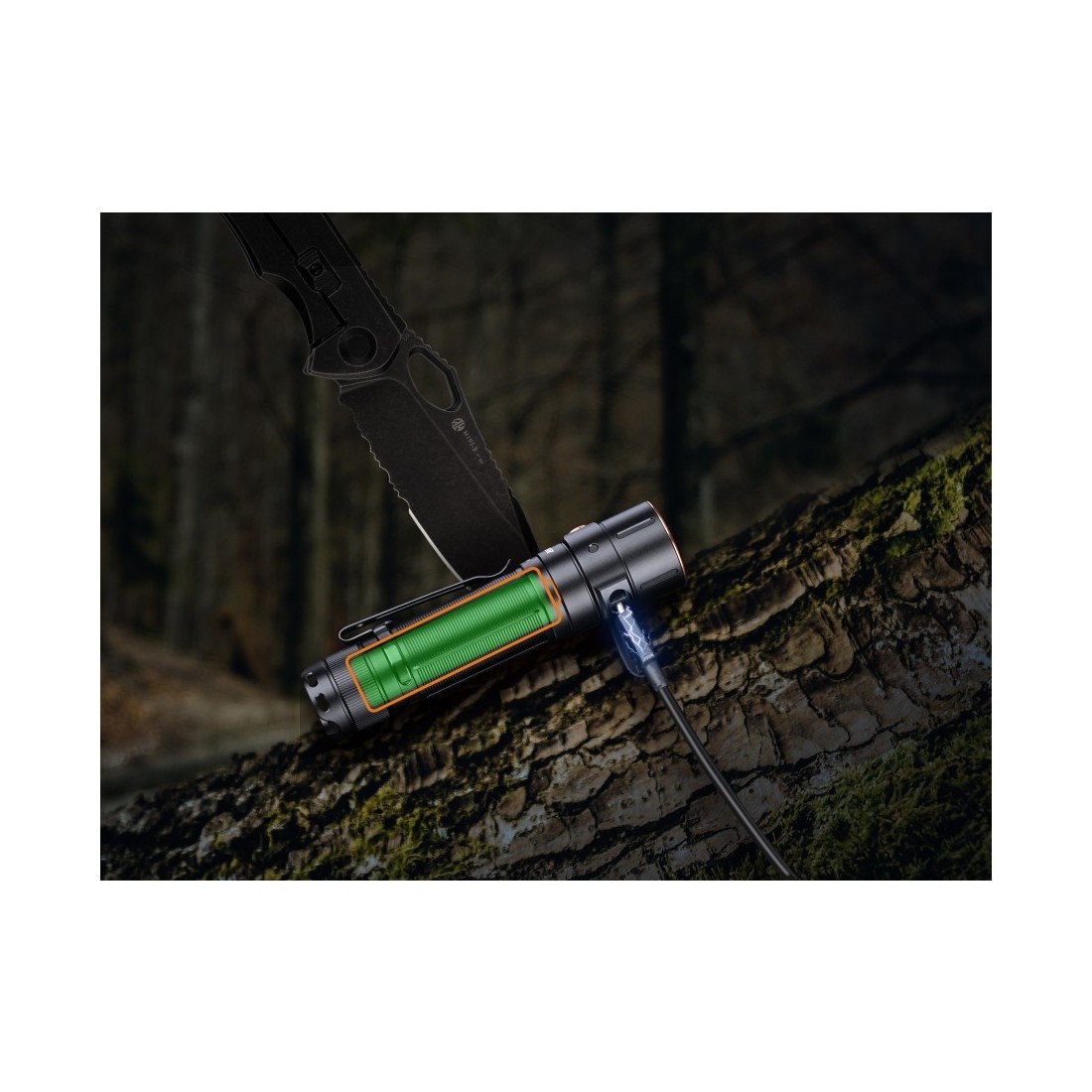Latarka ma wbudowany port ładowania USB-C, który umożliwia ładowanie akumulatora bez potrzeby korzystania z dodatkowej ładowarki. Wystarczy standardowy kabel USB-C (w zestawie) i źródło prądu np. power bank, laptop, komputer stacjonarny lub samochodowa ładowarka z gniazdem USB.