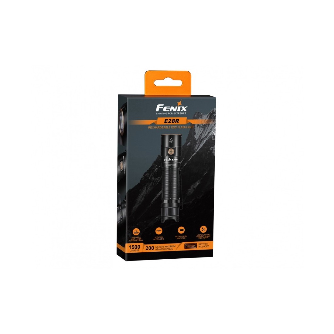 Fenix E28R to wszechstronna latarka edc o potężnym strumieniu światła 1500 lumenów, wyposażona w port szybkiego ładowania USB-C, praktyczny wskaźnik poziomu zasilania oraz akumulator ARB-L18-o pojemności 3400 mAh.