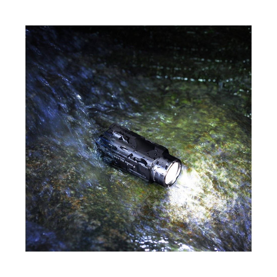 Latarka spełnia wymogi klasy IP68, co oznacza, że jest odporna na wstrząsy, wilgoć (mocny deszcz, zachlapanie, pełne zanurzenie w wodzie) oraz przenikanie drobnych ciał kurzu, dlatego może być używana do zastosowań taktycznych. Obejma montażowa wyróżnia się zwiększoną odporność na odrzut.