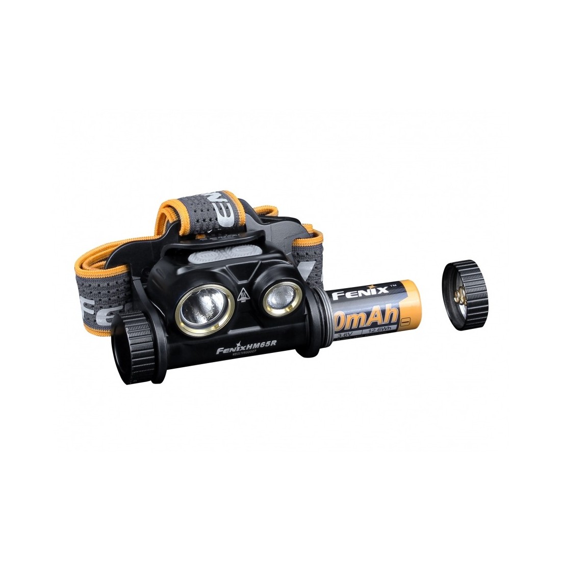 Czołówka Fenix HM65R zasilana jest akumulatorem 18650 (w zestawie), który można także zastąpić 2 bateriami jednorazowymi CR123. Zalecamy jednak stosowaniu akumulatora 18650, który gwarantuje pełne parametry światła oraz dłuższą pracę latarki.