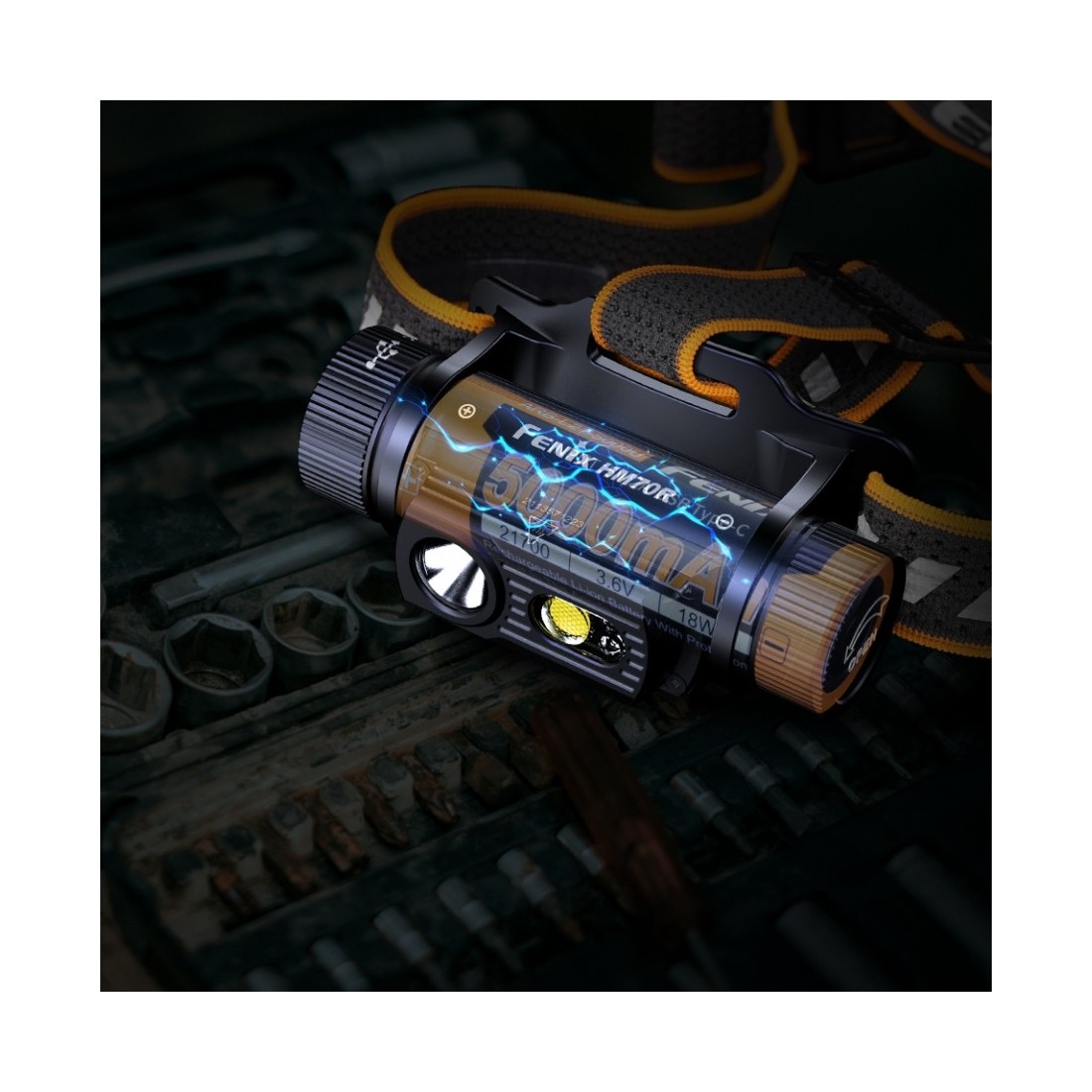Fenix HM70R zasilany jest za pomocą największego i najbardziej pojemnego ogniwa litowo-jonowego na rynku - 21700 ARB-L21 5000 mAh, które zapewnia do 100 godzin pracy w trybie niskim 30 lumenów, lub do 4 godzin sumarycznego czasu świecenia w trybie Turbo (1600 lumenów).