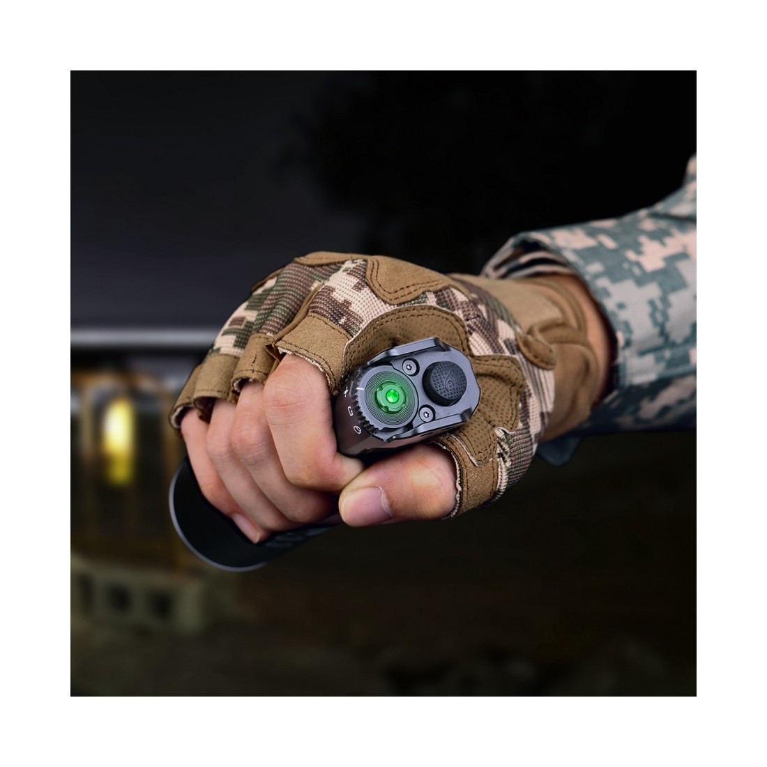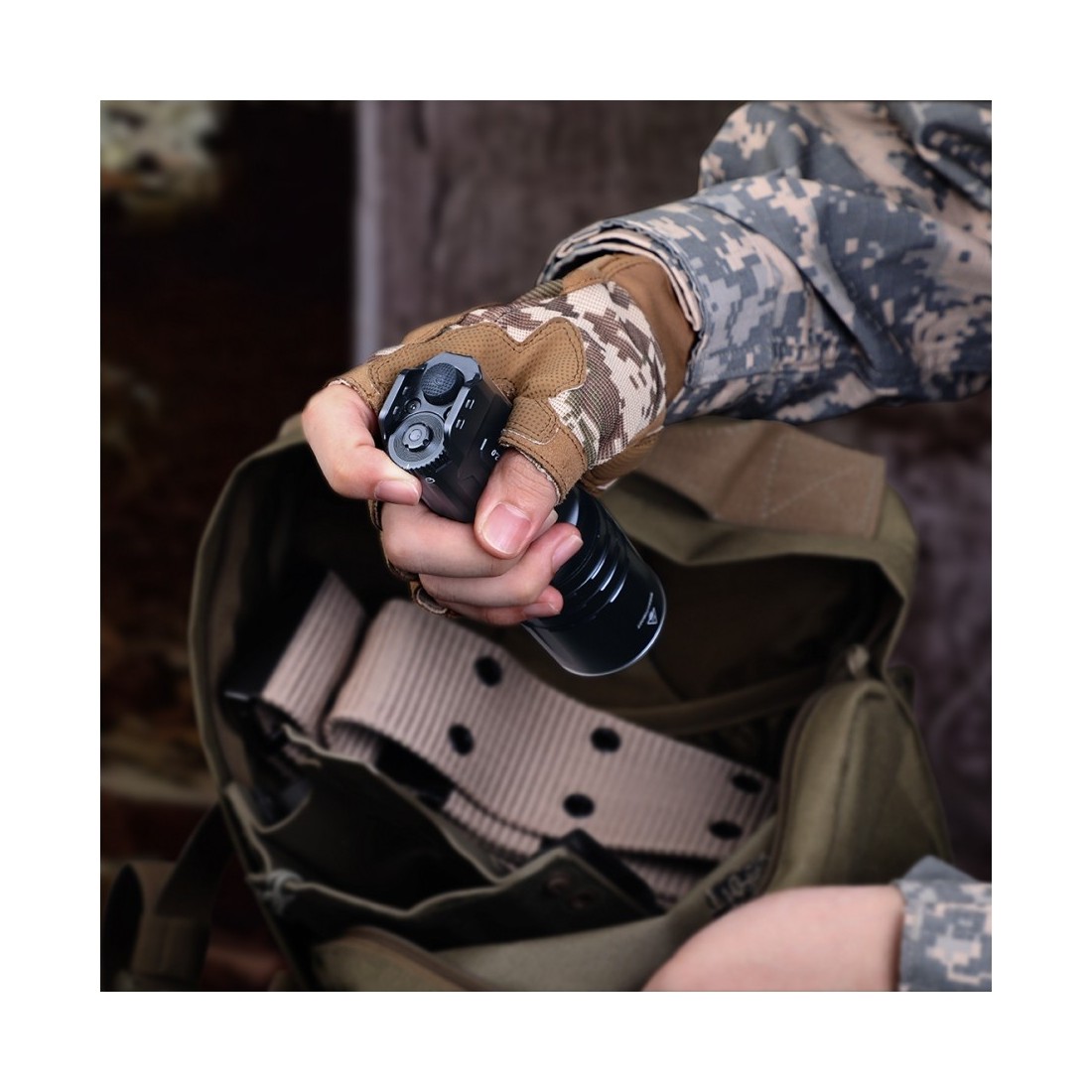 Fenix TK35UE V2.0 ma niezwykle funkcjonalny mechanizm obsługi składający się z gumowego włącznika taktycznego oraz obrotowego pierścienia do zmiany grup trybów. Wspomniany pierścień obrotowy można wygodnie obsługiwać jedną ręką, co pozwala na błyskawiczne przejście pomiędzy 3 dostępnymi trybami:
