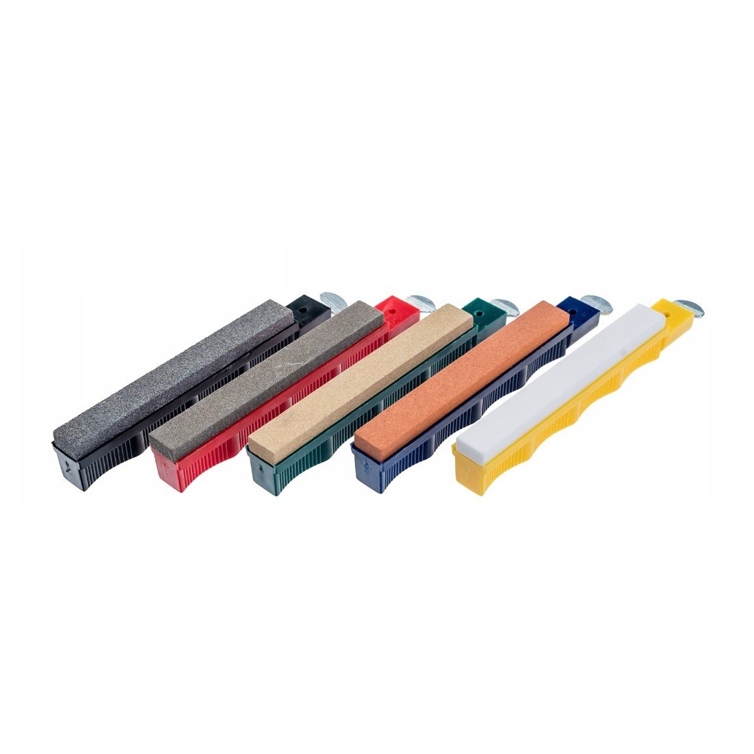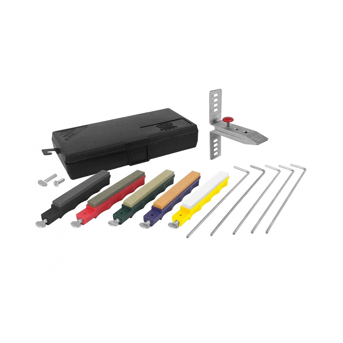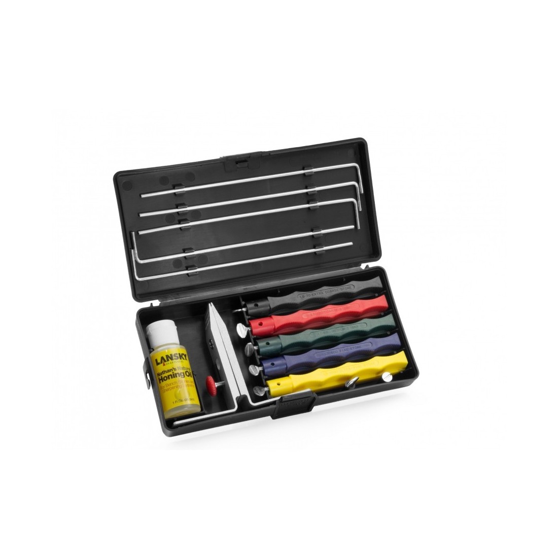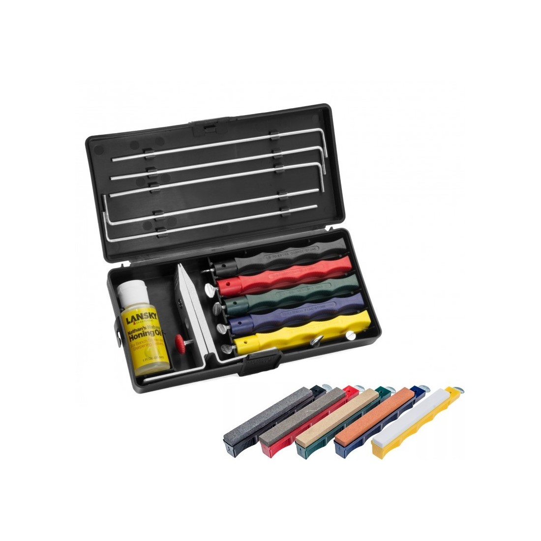W zestawie Lansky LKCLX znajduje się 5 kamieni ceramicznych, umożliwiających przeprowadzenie wszystkich czynności związanych z naprawą, ostrzeniem oraz polerowaniem krawędzi tnącej. Kamienie zamocowano w polimerowych obudowach o odmiennej kolorystyce pozwalającej na szybką identyfikację każdej gradacji.