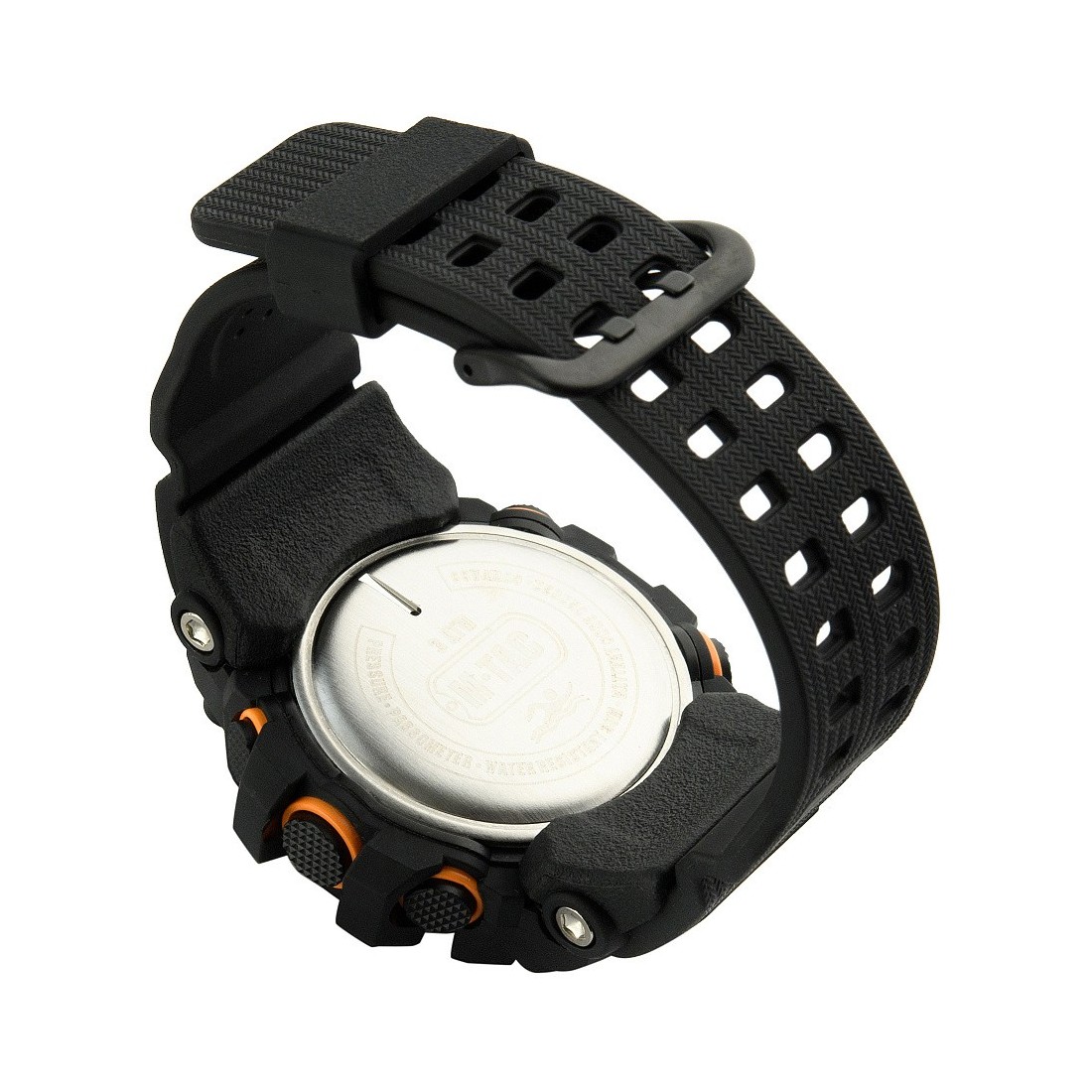 Taktyczny zegarek wielofunkcyjny wyposażony został w wytrzymałą obudowę wykonaną z poliwęglanu oraz bezel z wytrzymałej stali nierdzewnej.