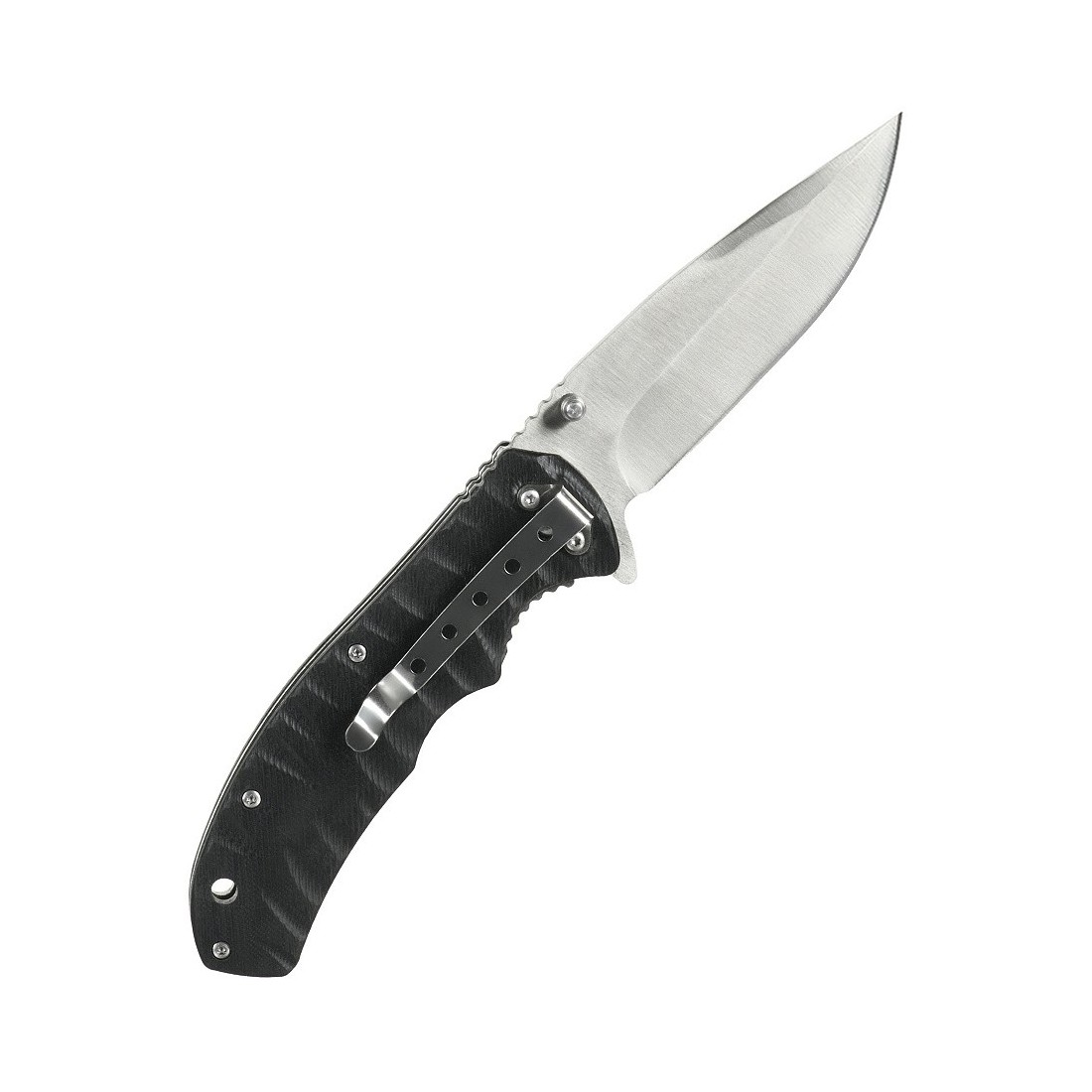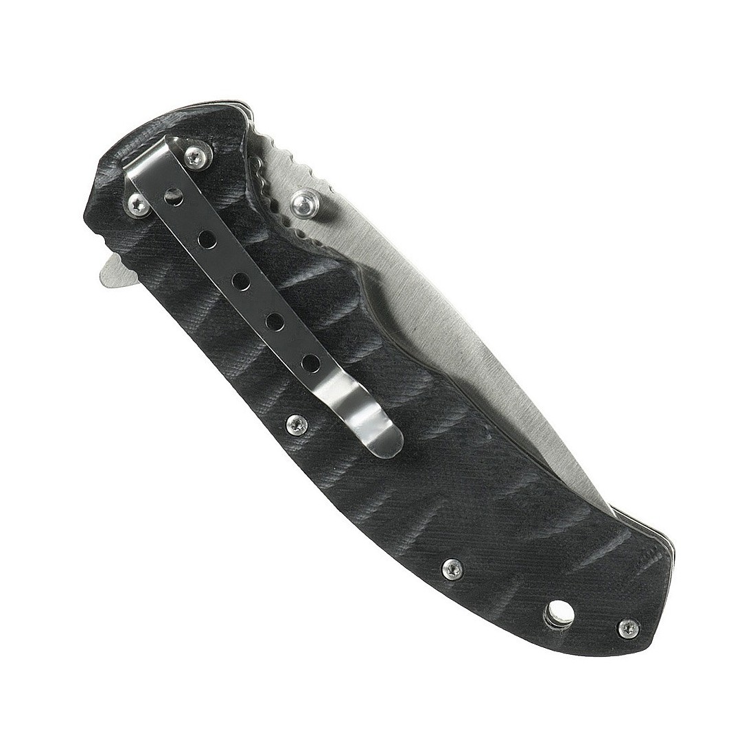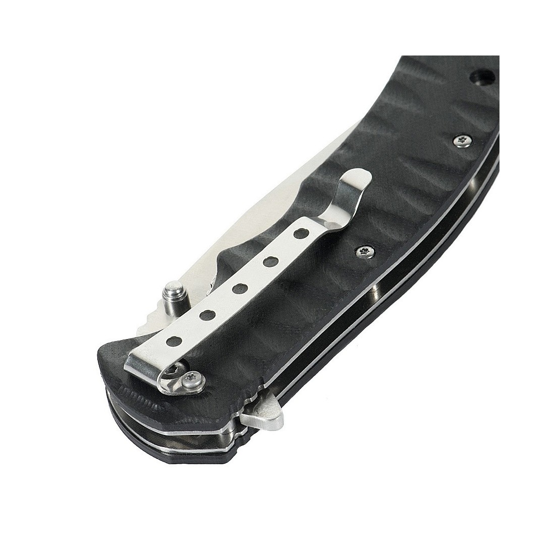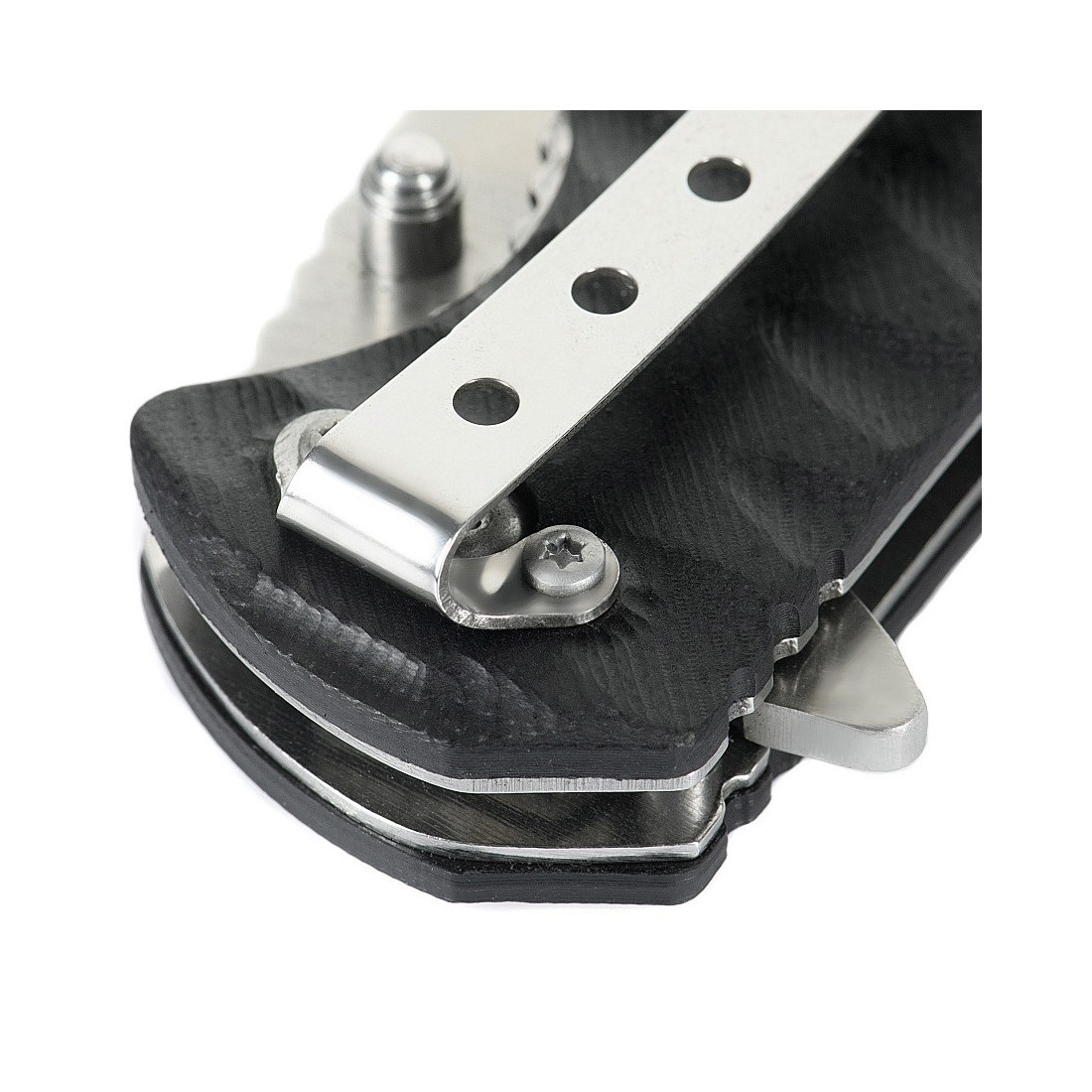 Klips pozwala na zamocowanie noża w kieszeni i znacznie ułatwia jego wyciągnięcie. Model ten posiada również otwór na smycz lub linkę zabezpieczającą.