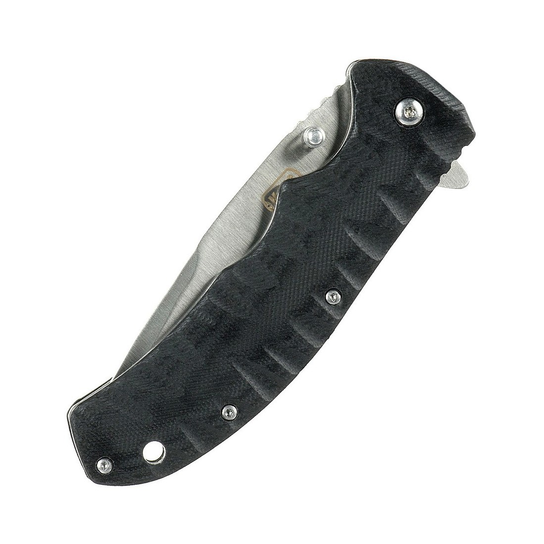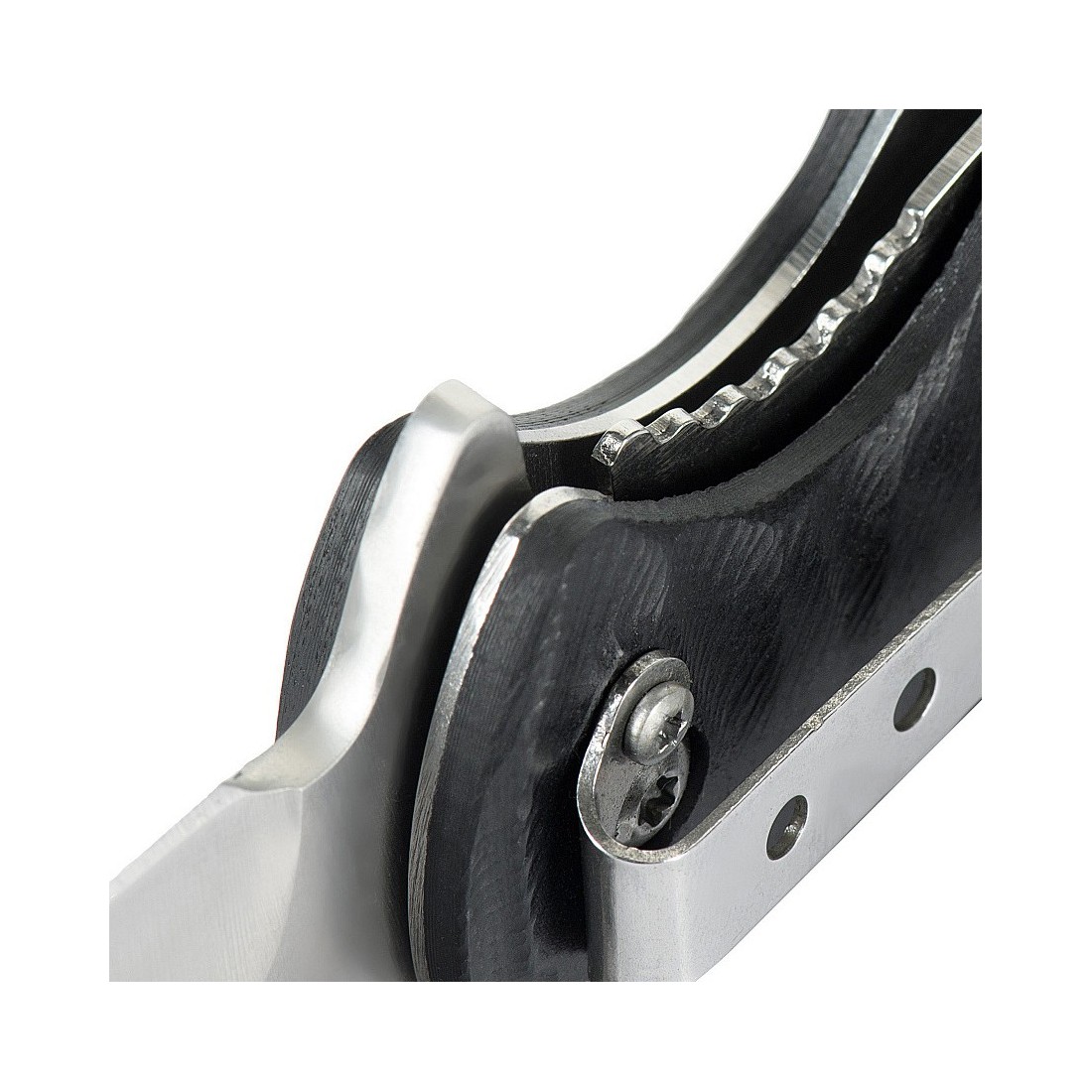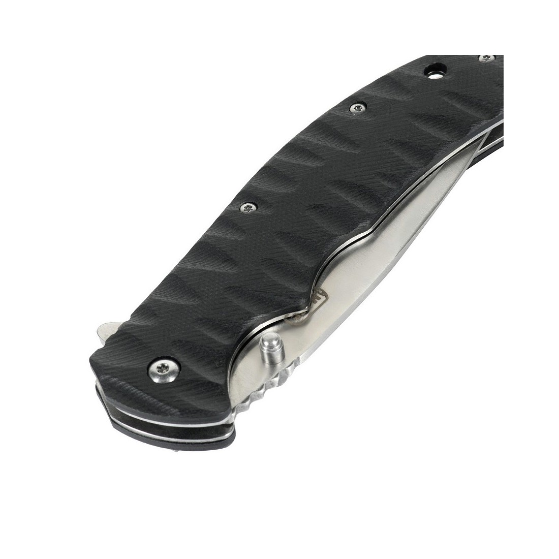 Rękojeść z nakładkami wykonanymi z lekkiego, twardego i sztywnego kompozytu G10 posiada ryflowaną antypoślizgową powierzchnię z nacięciami pod palce.