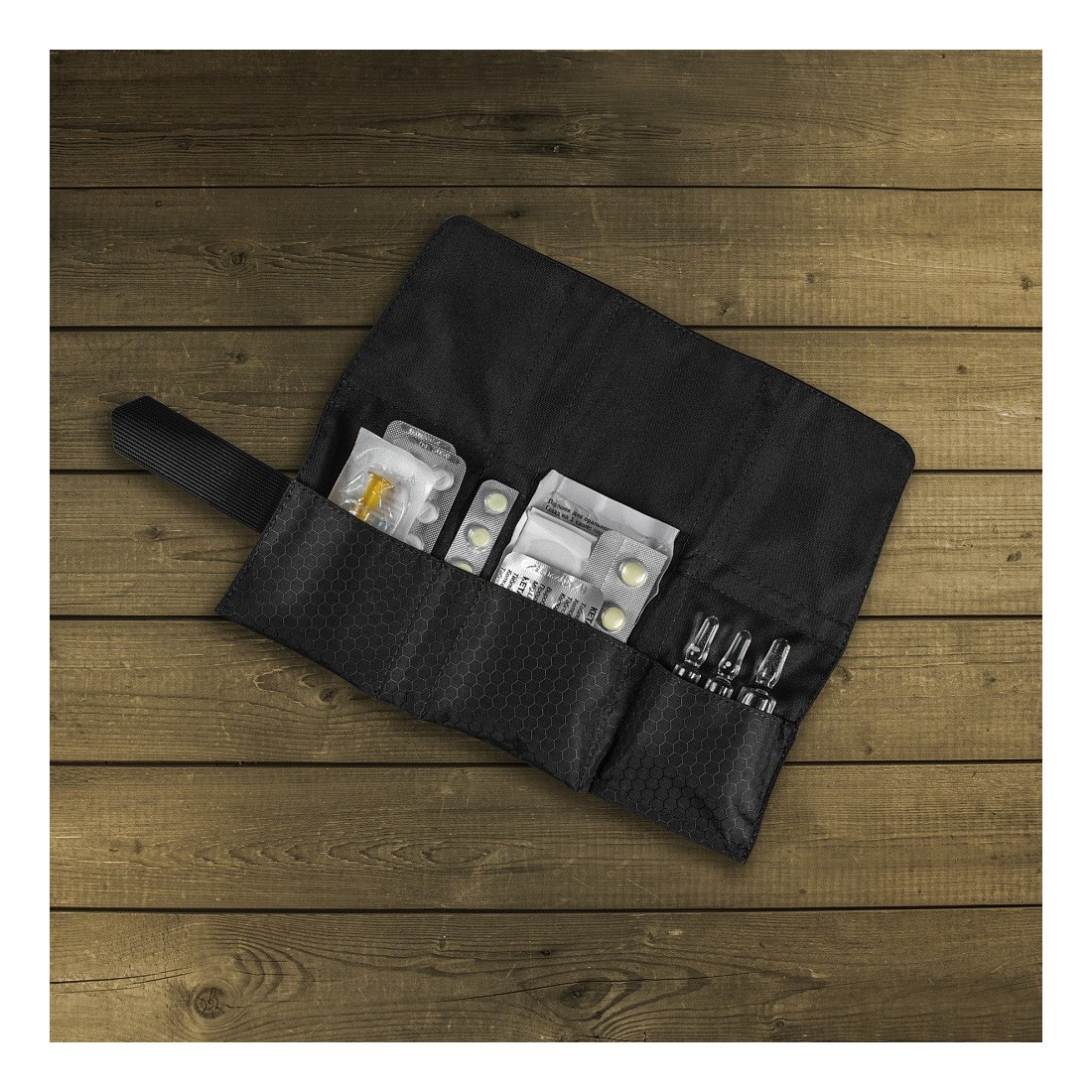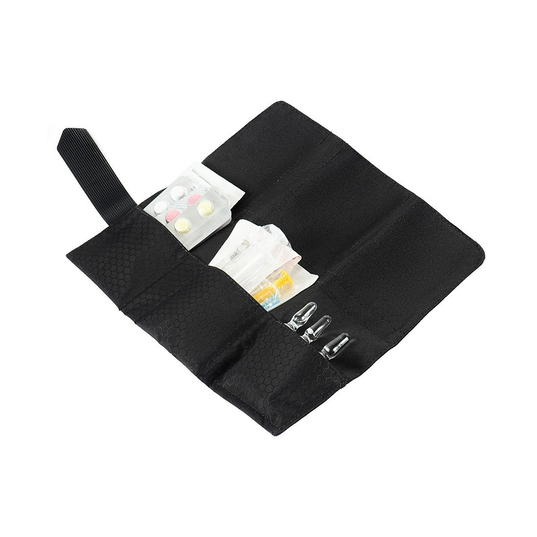 City Med Pouch posiada trzy komory do przewożenia indywidualnego zestawu medycznego: tabletek, plastrów, środków hemostatycznych, niewielkiej ilości opatrunków i innych.