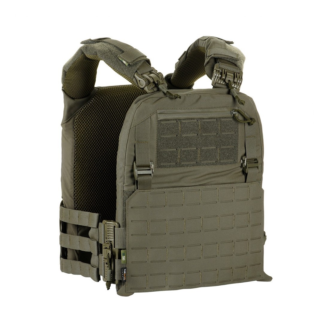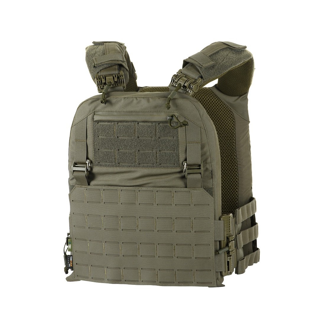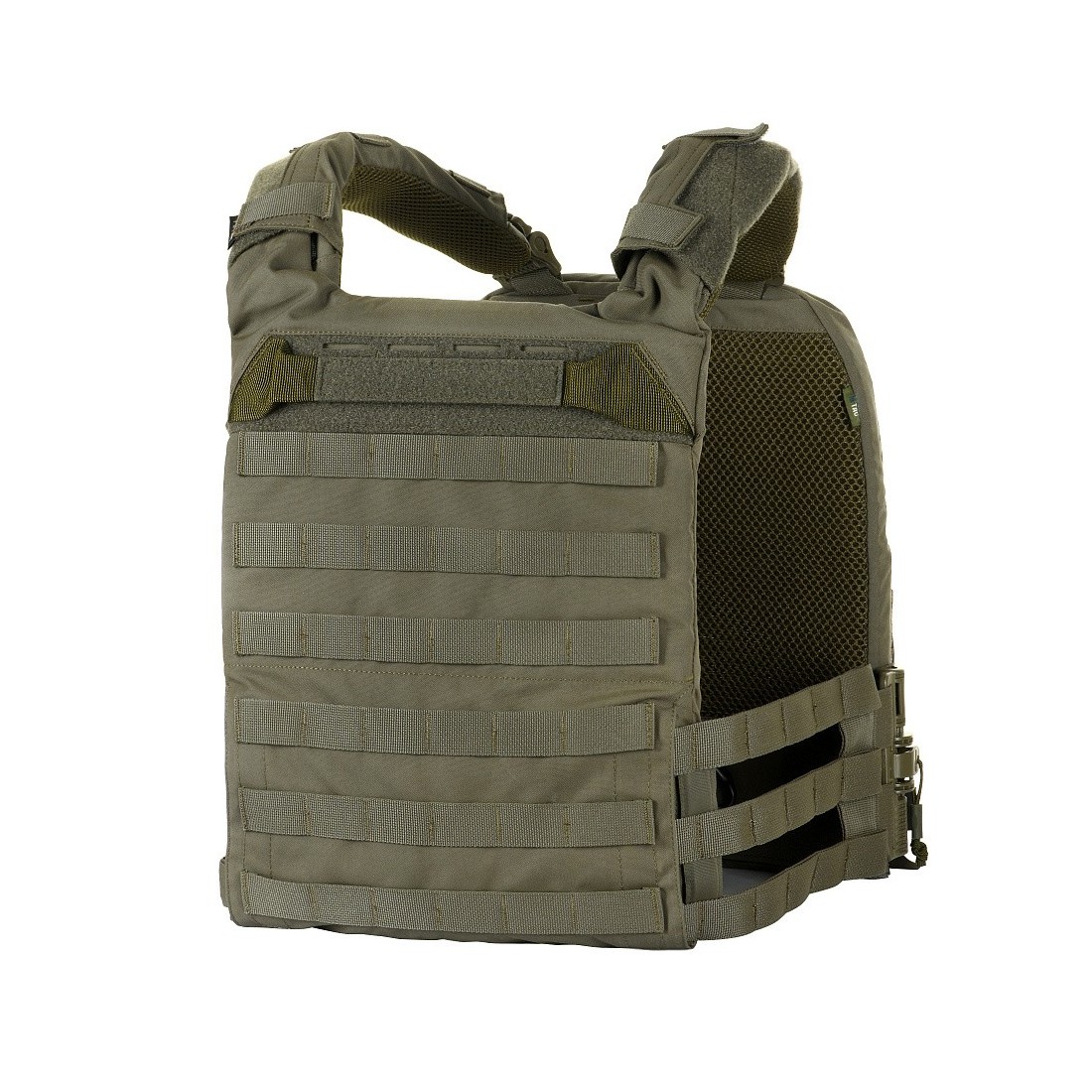 Kamizelka typu Plate carrier została wykonana z bardzo mocnego materiału odpornego na ścieranie i duże obciążenia Cordury 500D. Po wewnętrznej stronie kamizelki znajdują się wstawki z siatki 3D, które zapewniają amortyzację i cyrkulację powietrza.