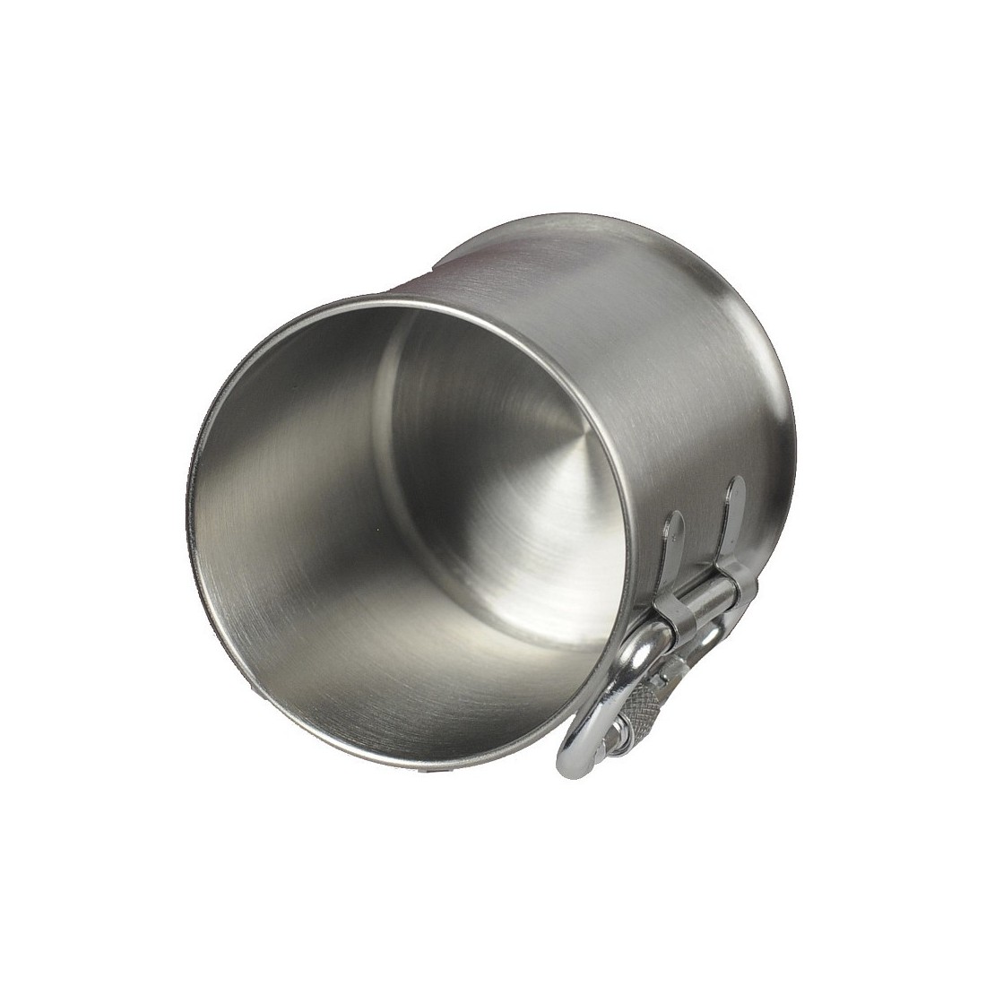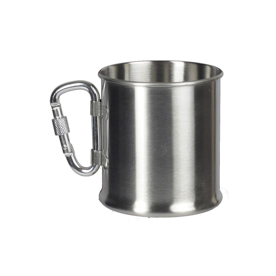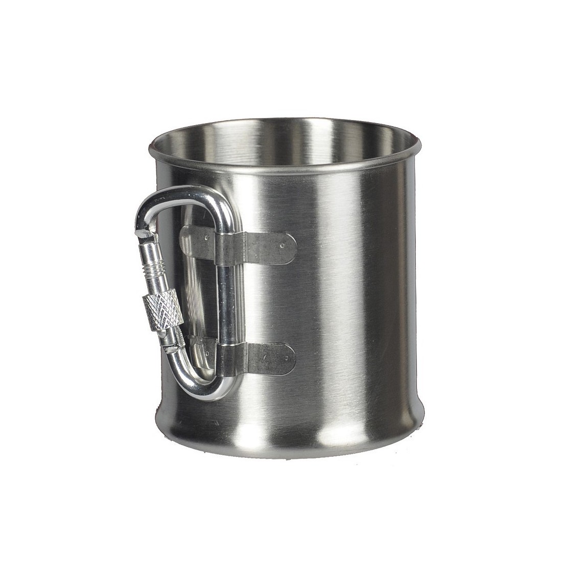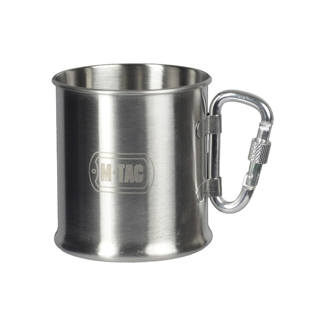 Kubek ze stali nierdzewnej z karabińczykiem o pojemności 250 ml od marki M-Tac. Zamiast rękojeści zastosowano karabinek.