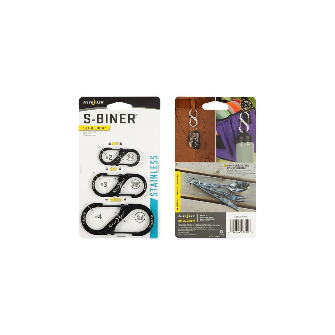 Zestaw trzech różnej wielkości stalowych karabinków Nite Ize S-Biner z blokadą zamknięcia SlideLock.Każda sztuka wykonana została z wysokiej jakości stali nierdzewnej i posiada po dwie funkcjonalne i łatwe w użytkowaniu przesuwane blokady z tworzywa sztucznego.