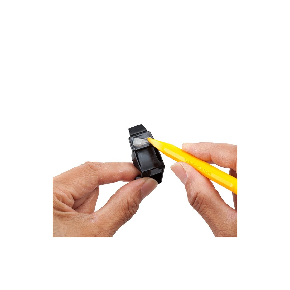Obsadka noża o przekroju kwadratowym, zabezpieczającym przed stoczeniem się noża ze stołu. Kształt ten pozwala również na pewne połączenie z nowym pojemnikiem na ostrza - i to na dwa sposoby.