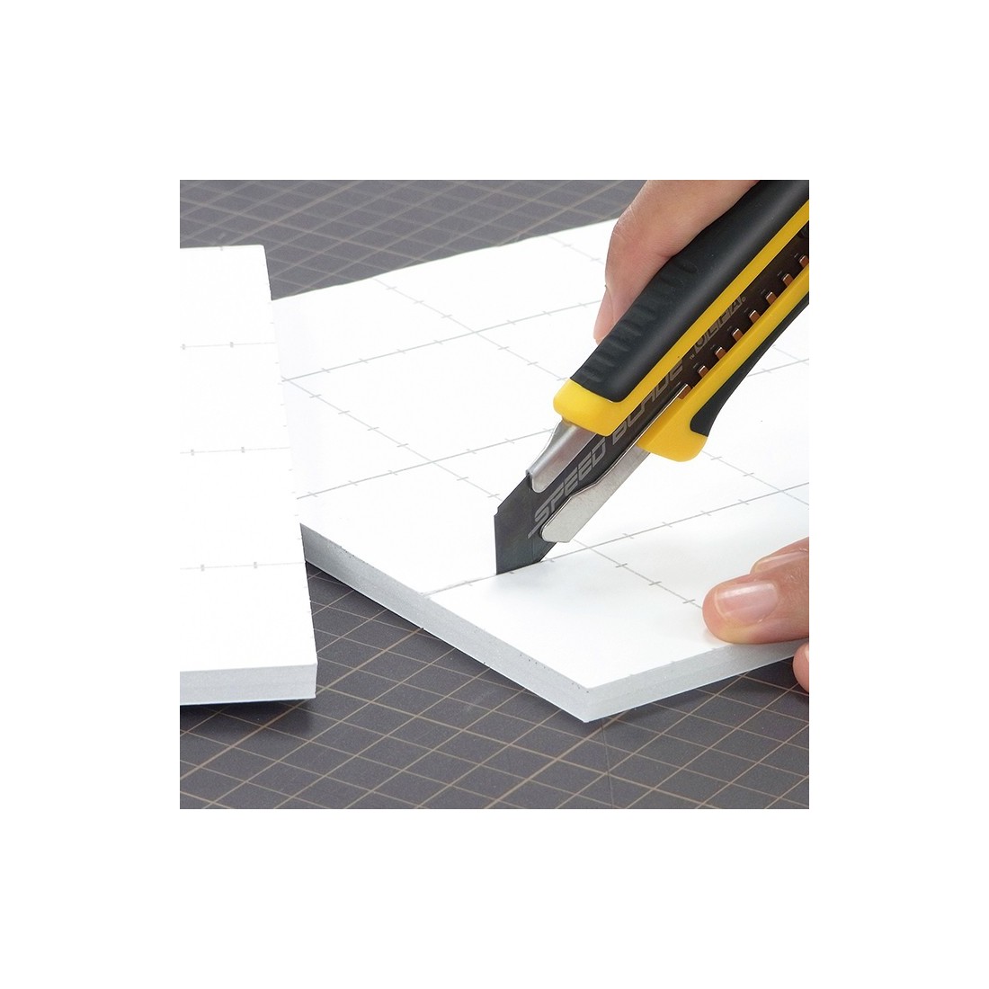 Dostosuj suwak automatycznej blokady za pomocą wstępnie ustawionych zapadek, aby ciąć z szybkością i dokładnością. Wymień ostrze bez narzędzi. Prosty zatrzask zapewnia nową krawędź.