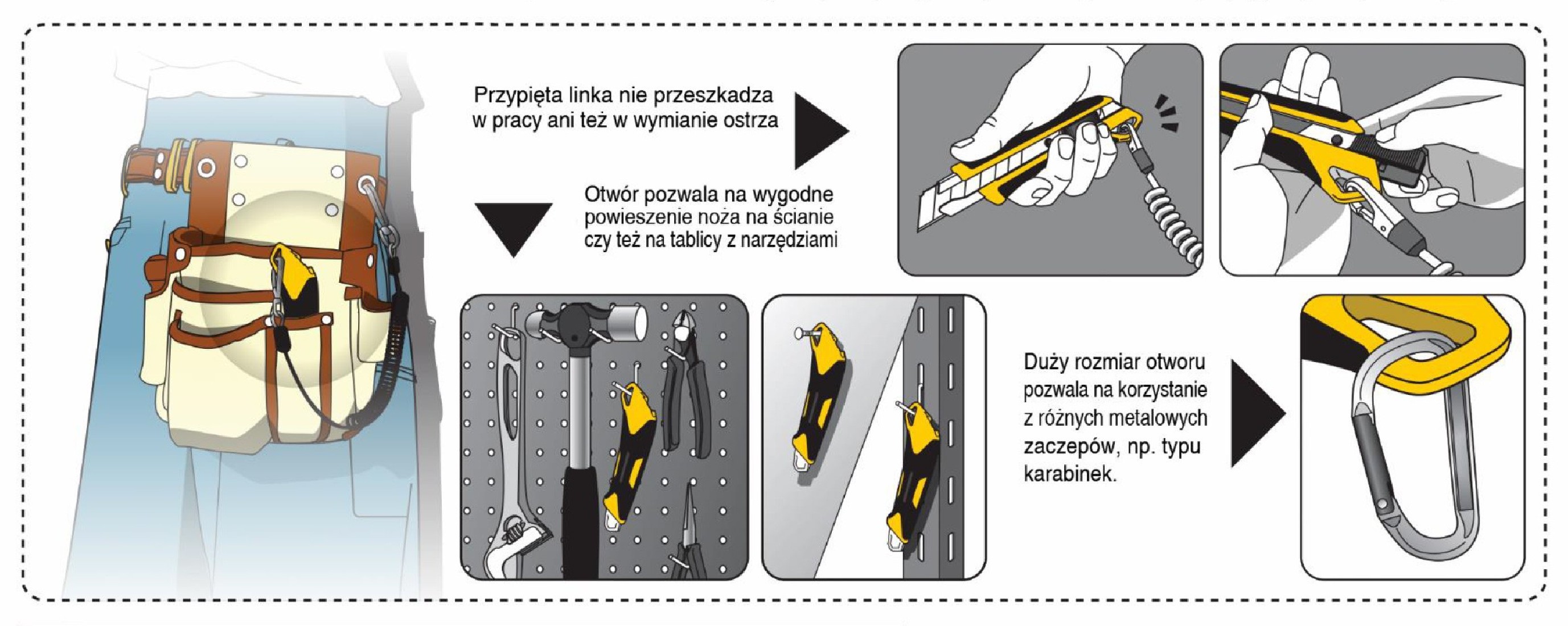 Przypięcie linki zabezpieczającej ma niewątpliwie wpływ na bezpieczeństwo przy pracach wykonywanych na wysokości. Przypięta linka nie przeszkadza w pracy ani też w wymianie ostrza, otwór pozwala na wygodne powieszenie noża na ścianie czy też na tablicy z narzędziami.
