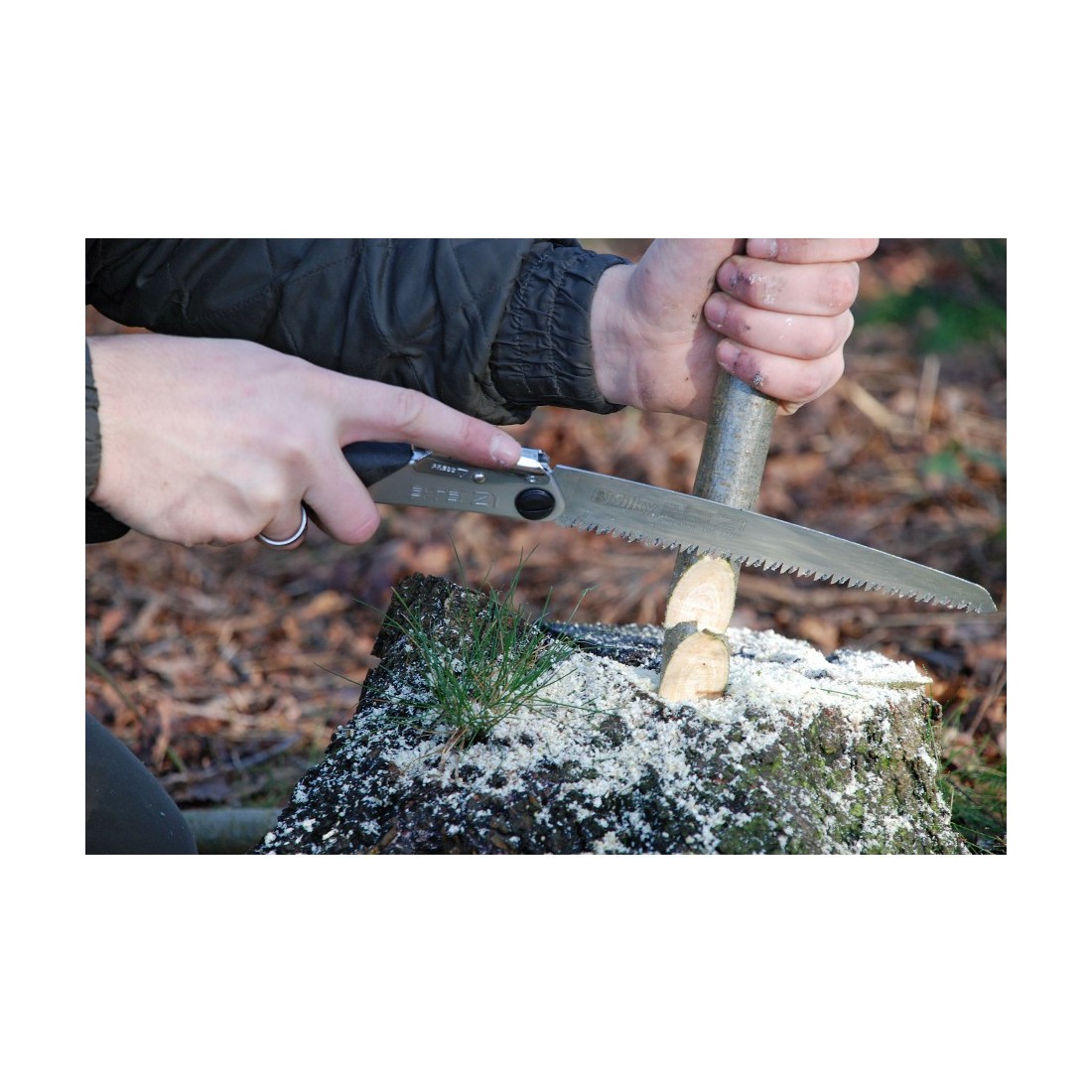 Piła składa się na zasadzie scyzoryka, co pozwala na bezpieczne przenoszenie jej np. w plecaku.