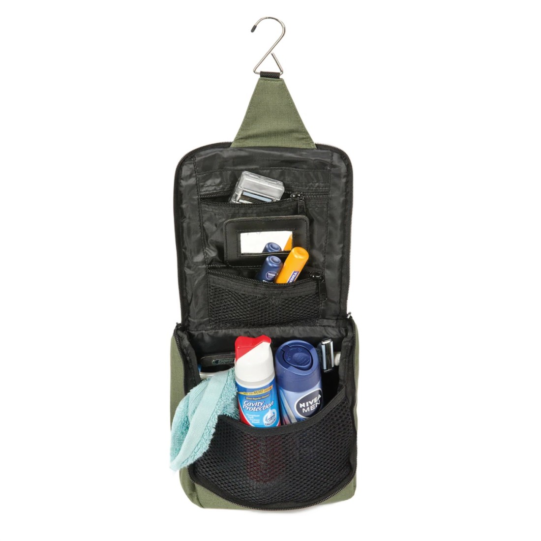 - Haczyk ze stali nierdzewnej: Dzięki niemu kosmetyczkę możesz zawiesić niemal wszędzie - w łazience, na gałęzi czy klamce.