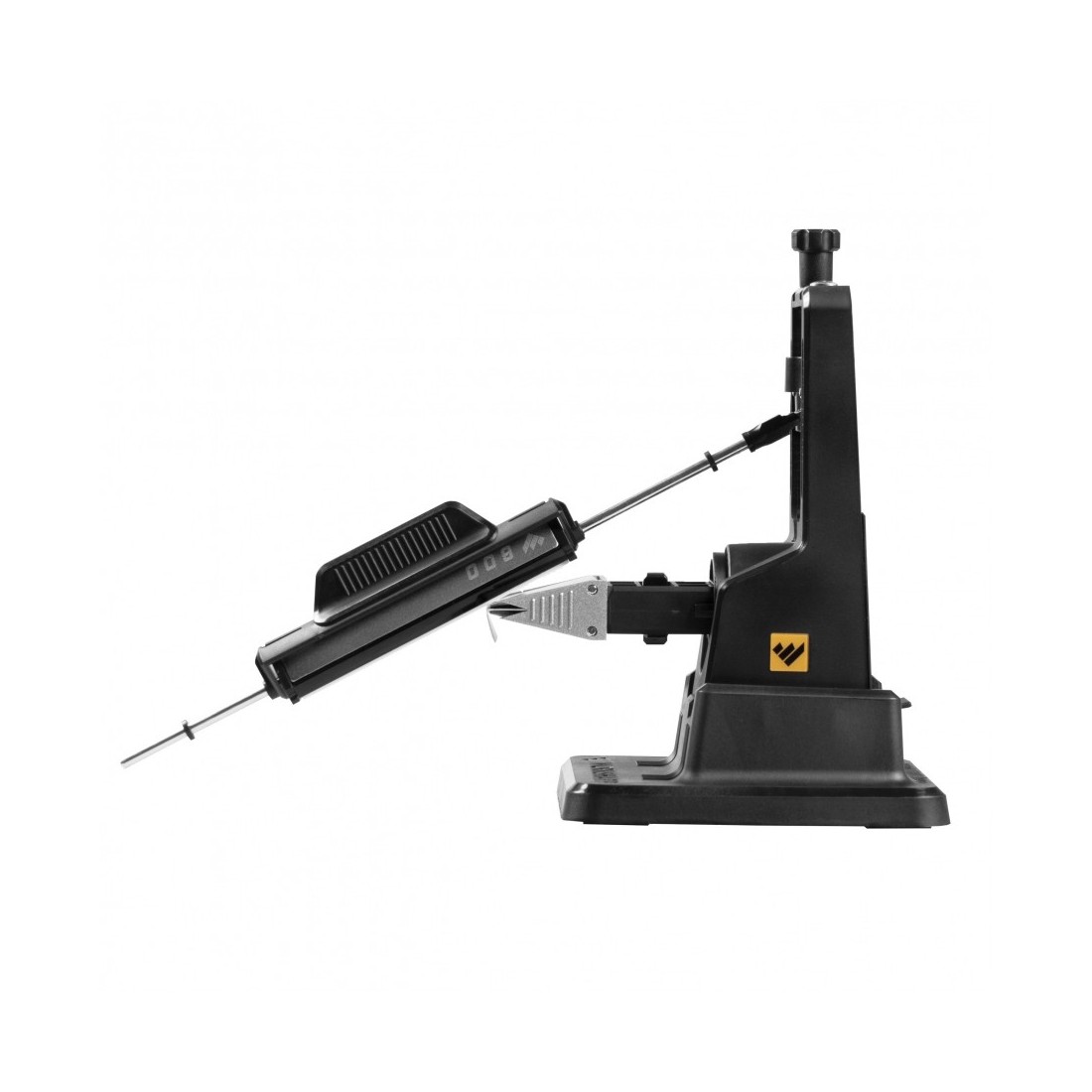 Stalowa prowadnica bloku ostrzącego zakończona jest przegubem kulowym, który gwarantuje utrzymanie stałego kąta oraz płynność ostrzenia. Prowadnica mocowane jest magnetycznie bez konieczności stosowania dodatkowych narzędzi.